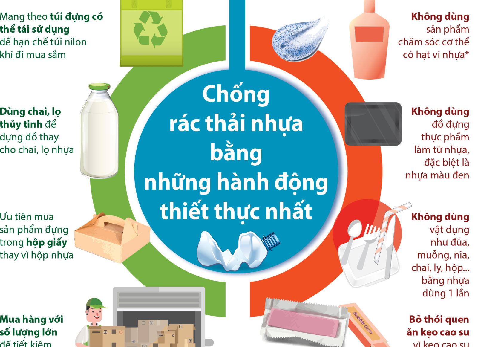 - Mỗi người hãy tự giảm đến mức thấp nhất việc sử dụng sản phẩm nhựa dùng một lần, túi ni-lông khó phân hủy, vỏ hộp xốp và từ bỏ thói quen vứt rác bừa bãi.