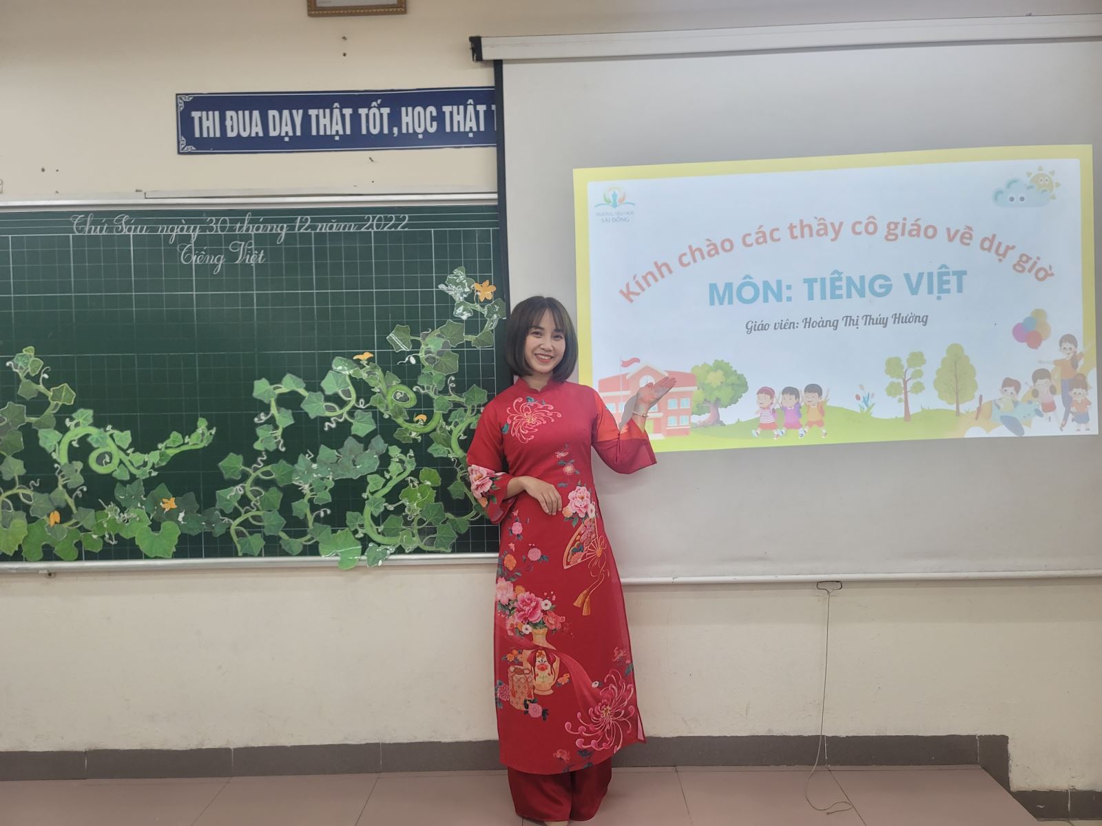 Trong tiết thực hành thi giáo viên dạy giỏi cấp Quận, cô Hường đã thể hiện tiết Tiếng Việt lớp 1, bài 80: Ôn tập – Kể chuyện. Tiết học diễn ra nhẹ nhàng, tươi vui dưới sự dẫn dắt gần gũi, ân cần của cô. Trong tiết học, tất cả các bạn học sinh đều háo hức ghép tiếng, viết từ vào bông hoa, quả bí của các em. Thông qua đó, vốn từ của các em đã được mở rộng thêm nhiều. Thành công nhất của tiết học này chính là các con có cơ hội rèn luyện kỹ năng đọc từ, đọc câu, đọc đoạn, được tìm hiểu thông điệp gửi gắm trong đoạn văn. Bên cạnh đó, Các bạn học sinh được ban giám khảo nhận xét chủ động tương tác với bạn, với cô, tham gia đánh giá nhận xét bạn tích cực.