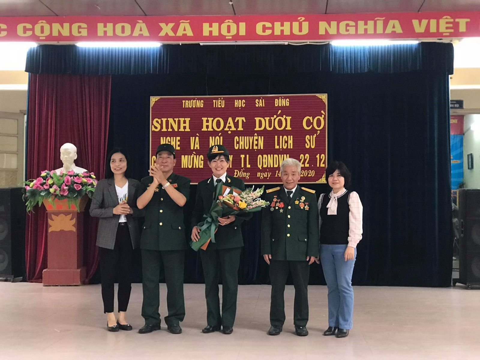 Mở đầu của buổi lễ là nghi lễ Chào cờ theo thể thức Đội. Tiếp theo chương trình, bác Đỗ Quang Bắc – nguyên là Chiến sĩ Phòng không không quân trong chiến dịch Điện Biên Phủ trên không, kể cho các bạn học sinh về lịch sử của Ngày thành lập Quân đội nhân dân Việt Nam 22/12, các em học sinh đã chăm chú lắng nghe và hăng hái tham gia giao lưu cùng với bác.