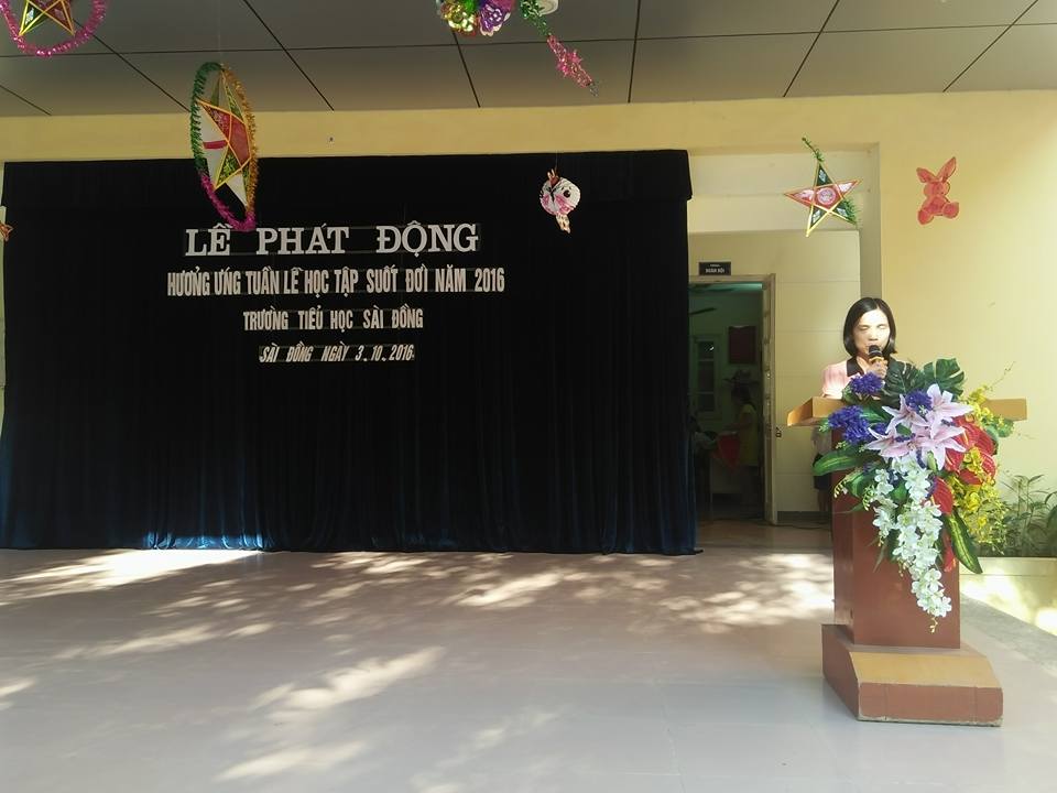 Thực hiện kế hoạch hoạt động của UBND Quận Long Biên và trọng tâm công tác tháng 10 của nhà trường, sáng ngày 3/10/2016, trường Tiểu học Sài Đồng long trọng tổ chức Lễ phát động "Hưởng ứng tuần lễ học tập suốt đời'' năm 2016 với chủ đề "Phát triển văn hóa đọc trong kỷ nguyên số". Lễ phát động đã nhận được sự tham gia hưởng ứng nhiệt tình của các thầy cô giáo và hơn 1440 em học sinh thân yêu.