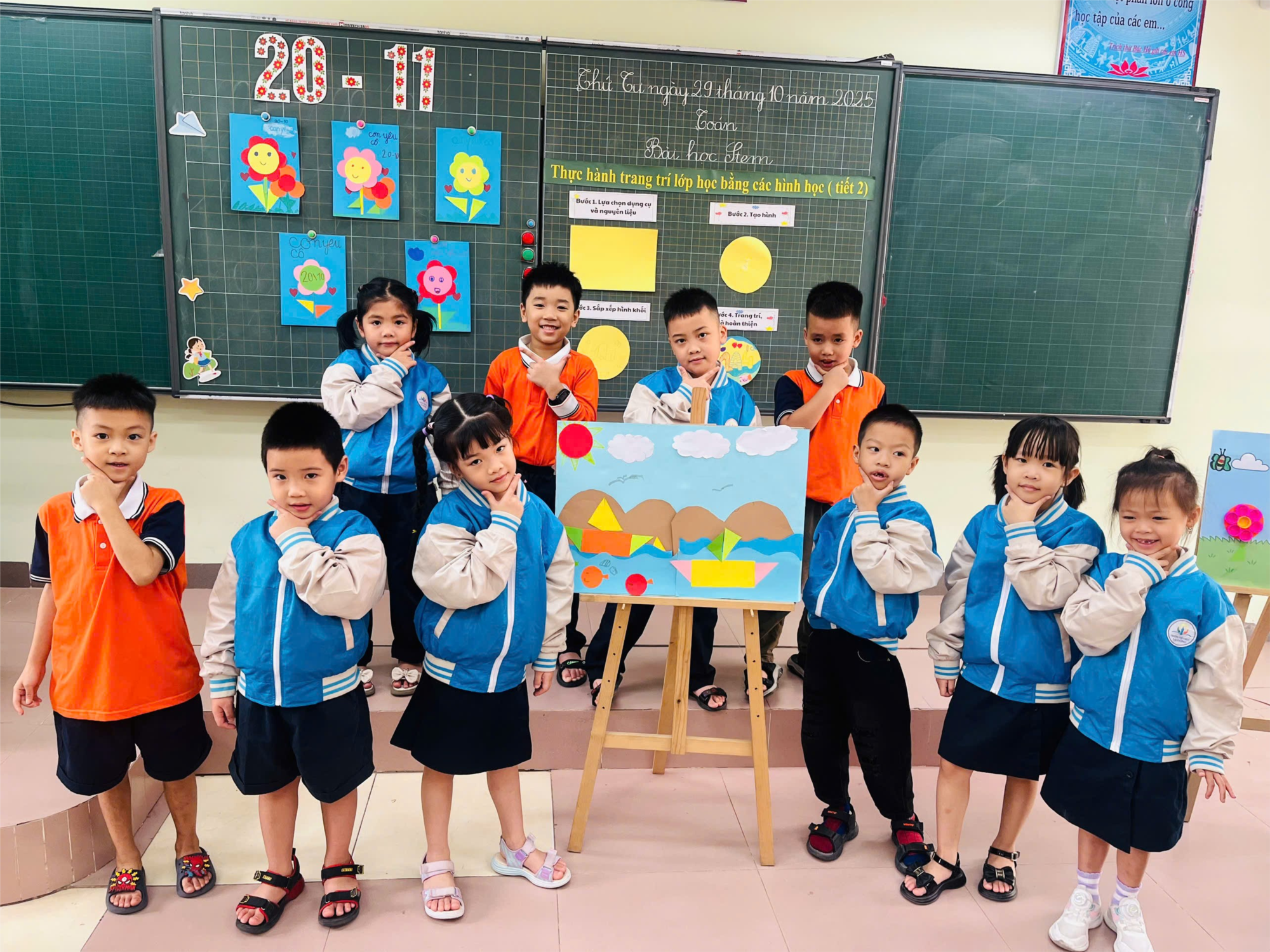 Tiết học không chỉ giúp các con củng cố kiến thức hình học một cách sinh động mà còn bồi dưỡng kỹ năng làm việc nhóm, giao tiếp, thẩm mỹ và tư duy khoa học. Nhìn các con say mê sáng tạo, tự tin trình bày ý tưởng và vui vẻ hợp tác, cô trò đều cảm nhận được niềm vui học tập và tinh thần khám phá trong mỗi hoạt động.