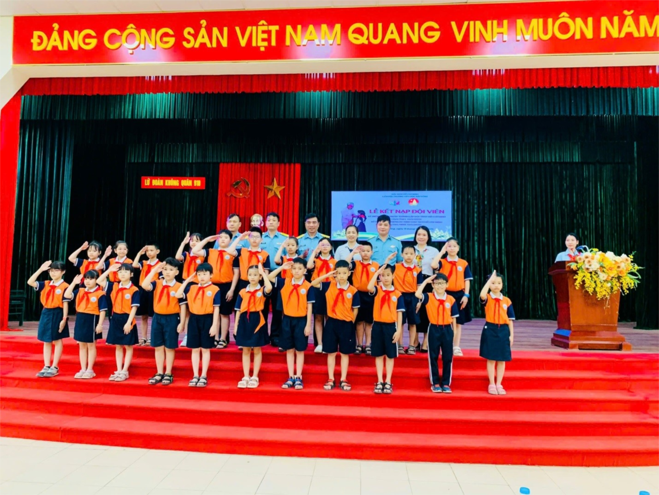 Trước khi bắt đầu chương trình, các thầy cô giáo và các con học sinh thực hiện nghi thức dâng hương tại Đài tưởng niệm Liệt sỹ tại Lữ đoàn 918. Tại đây, các thầy cô và các con học sinh làm lễ bái vọng để tỏ lòng thành kính tới anh linh Chủ tịch Hồ Chí Minh cùng các liệt sỹ Lữ đoàn 918. Mở đầu chương trình, bạn Nguyễn Hồng Hạnh – học sinh lớp 3A2 đại diện các bạn đội viên mới đọc đơn xin vào Đội, giọng đọc tuy còn non nớt nhưng thể hiện được sự quyết tâm, phấn đấu đứng trong hàng ngũ Đội của các em thiếu nhi. Tiếp đó, cô Đinh Thị Thúy Hà – Bí thư Chi đoàn nhà trường đọc quyết định kết nạp Đội viên mới. Sau đó các em được các cô giáo trong Ban Giám hiệu nhà trường cùng các đồng chí thuộc Lữ đoàn 918 trao tặng những chiếc khăn thắm hồng trên vai. Và từ giờ phút này, các em đã trở thành những đội viên Đội TNTP Hồ Chí Minh.
