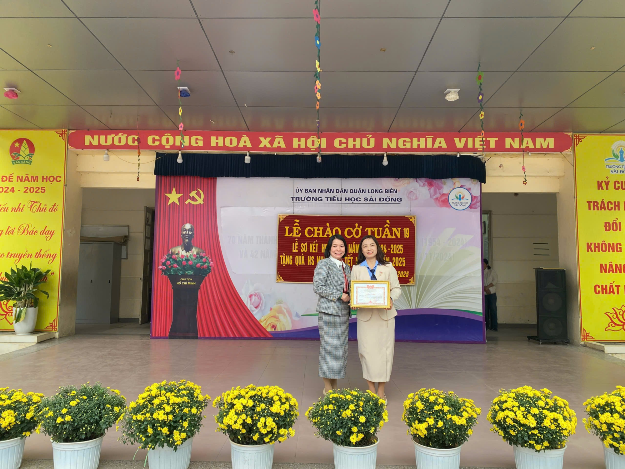Tiếp theo chương trình là phần khen thưởng cho cá nhân và tập thể có thành tích trong học kì I vừa qua gồm có: Giáo viên, chi đội có thành tích xuất sắc trong Công tác Đội và phong trào thiếu nhi năm 2023 – 2024; Giáo viên có thành tích xuất sắc trong công tác Khuyến học phường Sài Đồng năm 2024, học sinh tích cực tham gia phong trào kế hoạch nhỏ đợt 1 đã được khen thưởng với mục đích khích lệ tinh thần, tiếp tục phát huy những thành tích trong công tác giảng dạy của giáo viên, của học sinh cũng như các tập thể lớp trong học kì II tới đây.